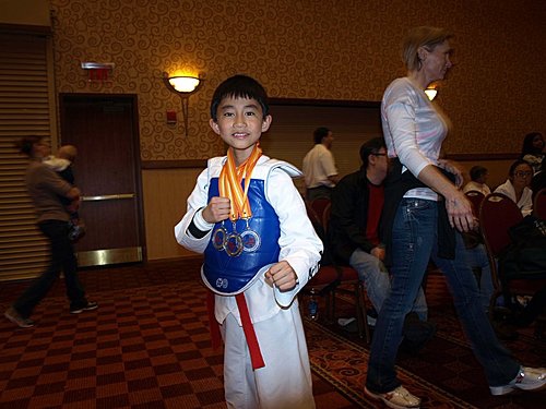 MATTHEW 參加八-九歲組,五十五磅以下紅帶。參加項目有 拳式 武器還有對打。