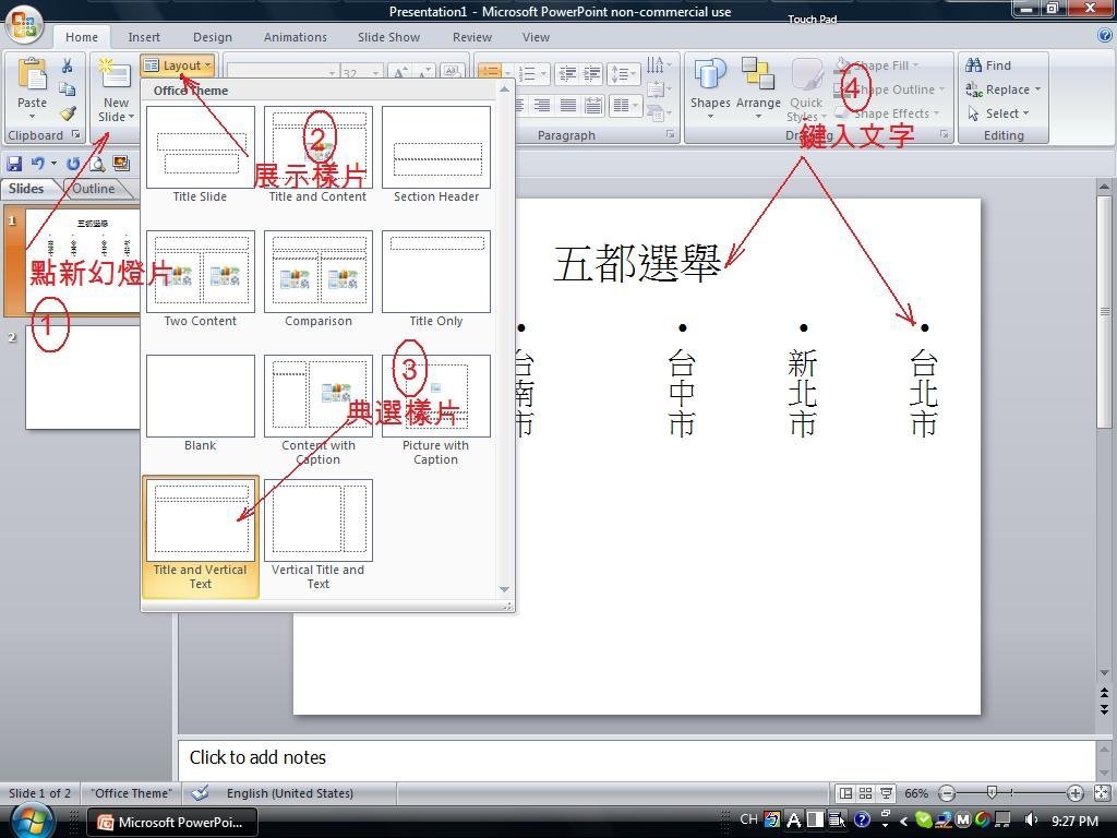 標題雖是簡報製作,其實應當是可用PowerPoint能作甚麼比較適當,點擊新投影片後在點選展式樣片,現在選的是標題在上,鍵入文字時字體字型,大小顏色位置都可任選。