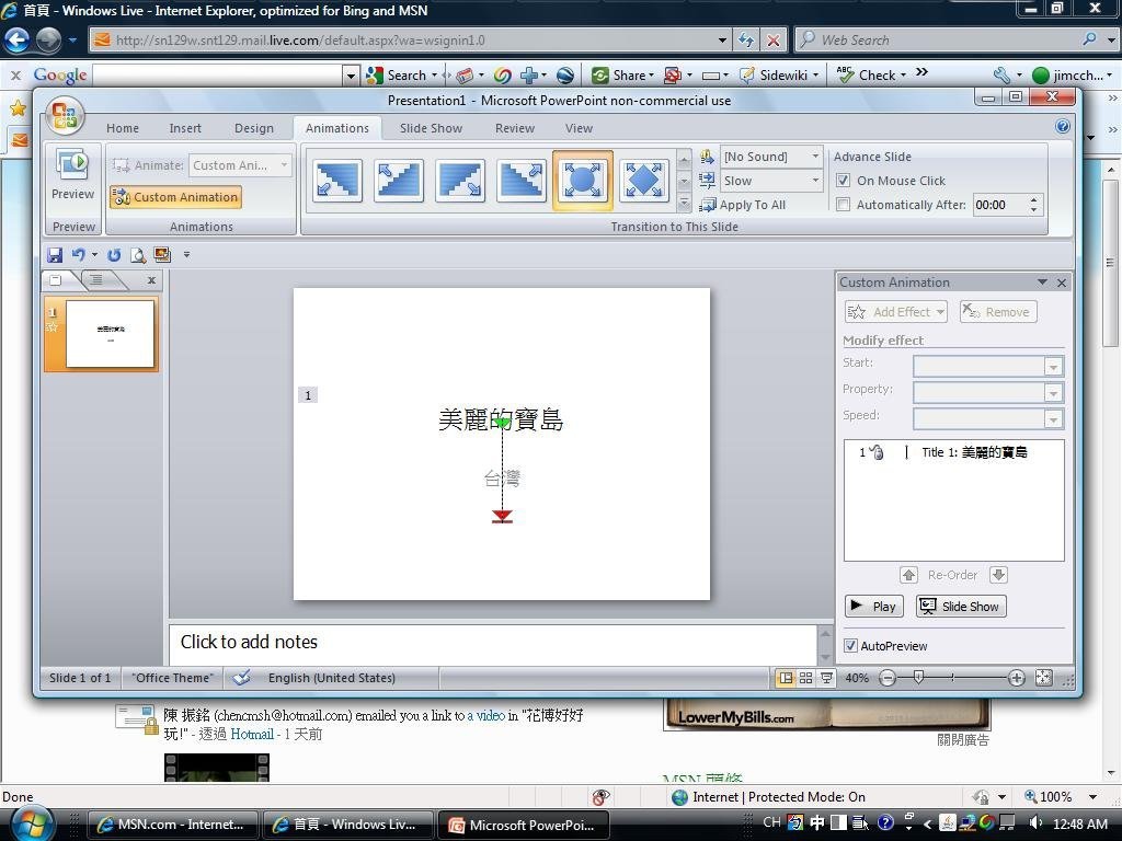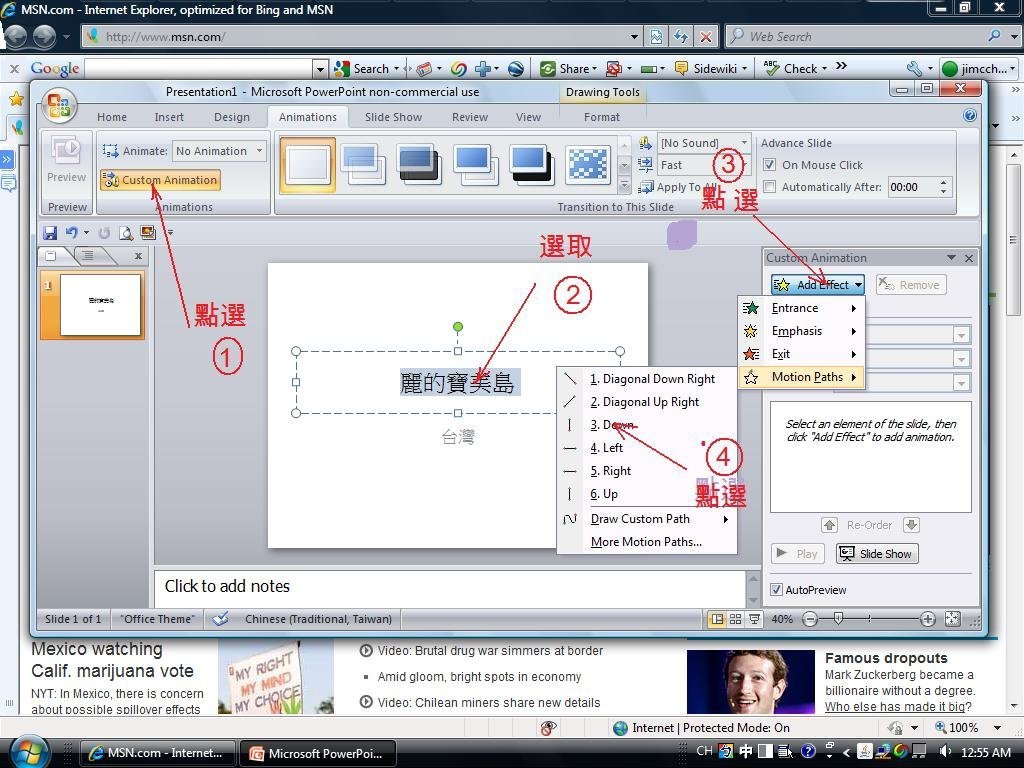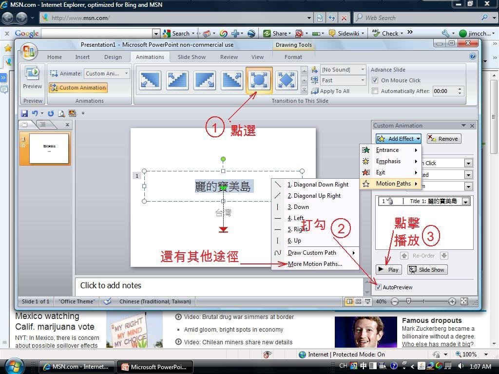 加入動畫,點選動畫後就有動畫任你選取,只要移動滑鼠可立即預覽,點擊就可選取。現在圖面上現點擊自訂動畫,再選取你要動畫的文字圖形等,再選取特效這比較有創意也算高階動畫,現在可用滑鼠再上面滑動預覽候選取,在圖上點選星星小圖行動畫途徑,左邊立即顯示圖徑圖示,所選取的文字或圖形,點擊播放後就會按圖徑移動,下面還有自訂圖徑,下次再詳述。