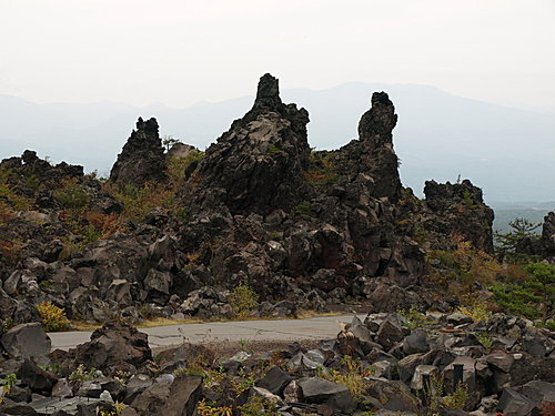 鬼押出し園,名列日本三大旗勝景觀,又名地獄谷1783年淺間山那次火山大爆發,溶漿不斷噴出火山口,最後的黑色的溶漿熔岩,因遇到寒冷氣候瞬間冷卻,而行成奇異賺觀的奇石。